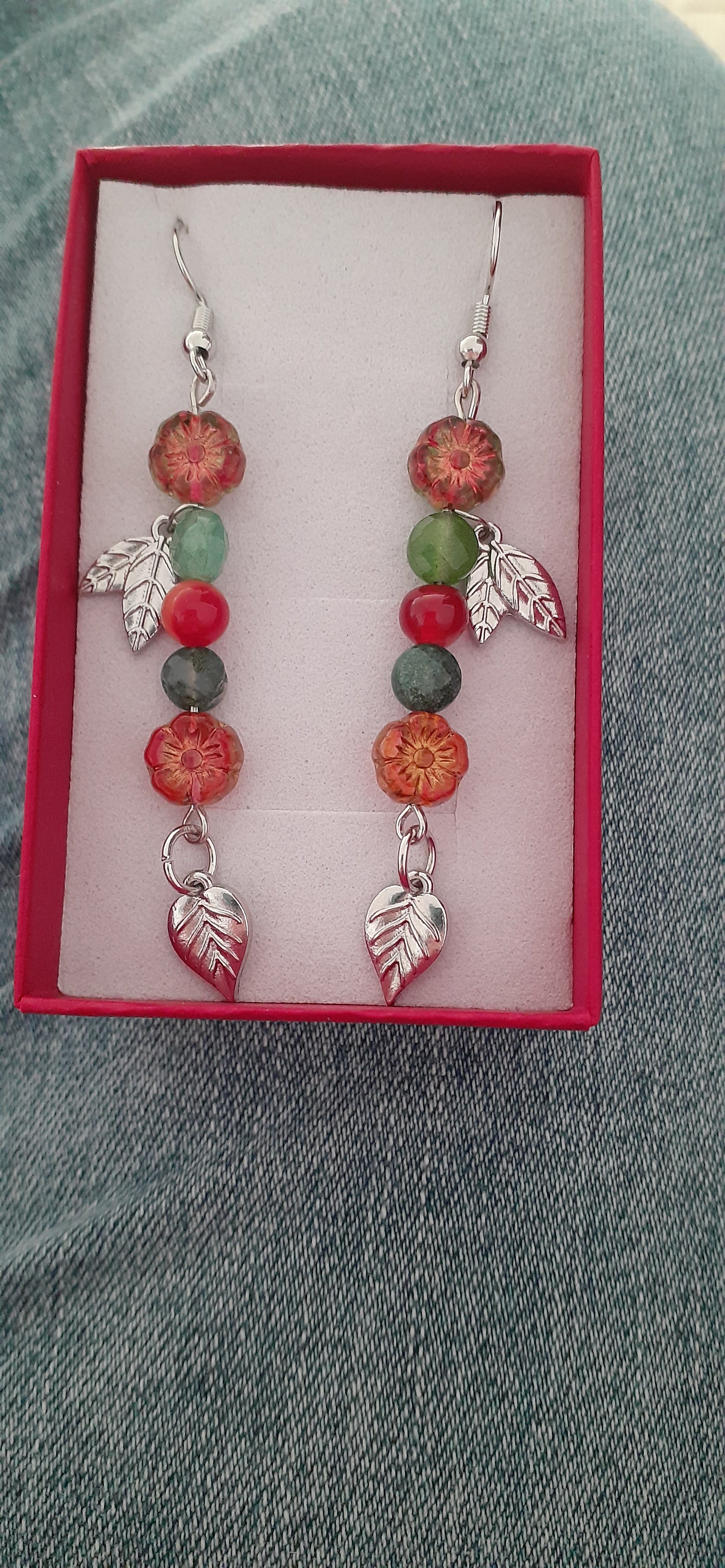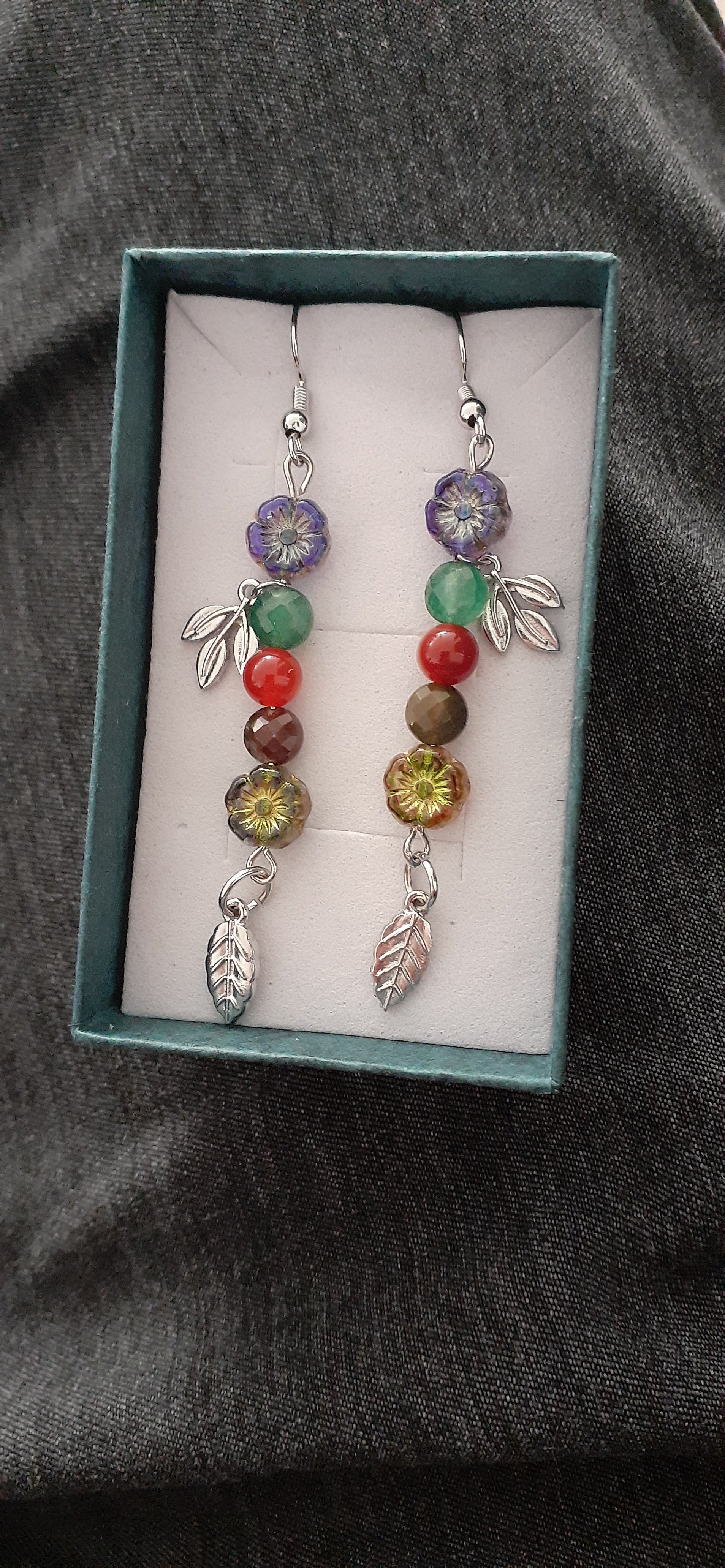 "Falling Into You" beaded drop earrings w/ leaf charms; Approx. 3" L